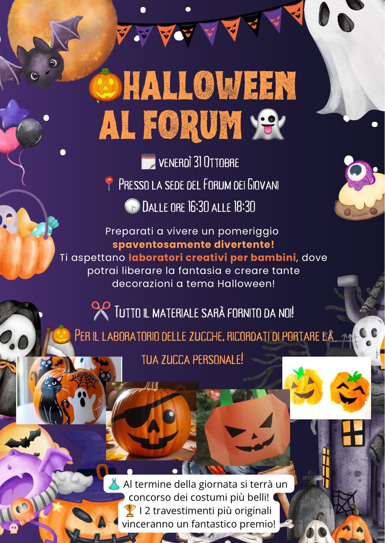 Nel pomeriggio dello stesso giorno, dalle 16:30 alle 18:30, i ragazzi under 13 hanno preso parte a laboratori creativi presso la sede del Forum. I partecipanti hanno avuto la possibilità di realizzare decorazioni a tema Halloween con tutto il materiale fornito dagli organizzatori, e per il laboratorio delle zucche è stata richiesta la zucca personale di ciascun partecipante.